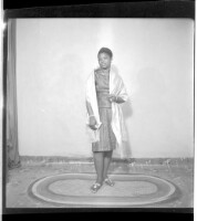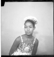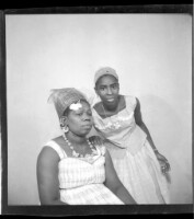 Two women, one sitting wearing a white dress, necklace, earrings, and a headscarf, and the other standing wearing une camisole, a skirt, a white headscarf, necklace, and earrings in the studio.