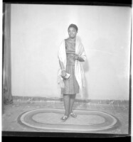 A woman standing wearing a une camisole and a black skirt, a white headscarf, a necklace, and earrings in the studio.