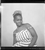 A woman wearing a black and white une camisole, a necklace, a headscarf, and earrings, sitting in profile in the studio.