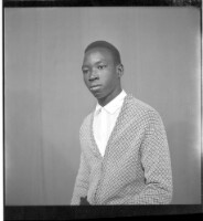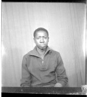 A young man wearing a black long sleeved t-shirt facing forward in the studio.