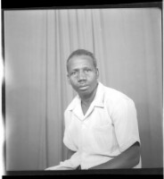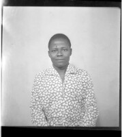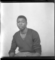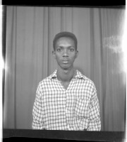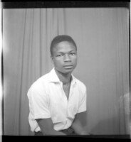 A young man wearing a short sleeved dress shirt sitting facing forward in the studio.