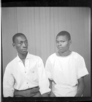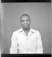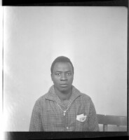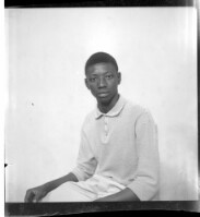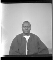 - A man sitting facing forward in the studio wearing a white t-shirt and black boubou.