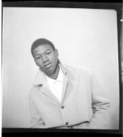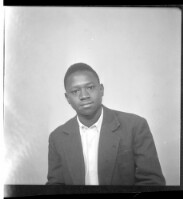 - A young man sitting facing forward in the studio wearing a white dress shirt and suit.