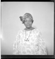 - An old woman wearing a une camisole and a headscarf sitting facing forward in the studio.