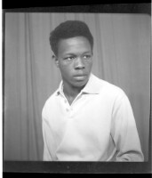 A young man sitting facing forward in the studio wearing two long sleeved shirts.
