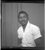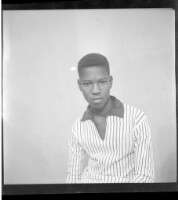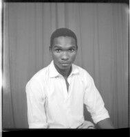 A man sitting facing forward wearing a white short sleeved dress shirt in the studio.