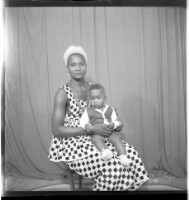 Full shot of a woman sitting wearing a une camisole and a black and white pagne, a necklace, a white headscarf, earrings, and holding in her hands a little boy wearing a black and white shirt and white shoes facing forward in the studio.