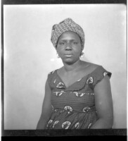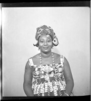 A woman sitting facing forward in the studio wearing a une camisole, a headscarf, ""tourekalla,"" a Fulani hairstyle, earrings, a large necklace, and smiling.