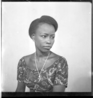 A young woman sitting in profile in the studio wearing a black short sleeved shirt, a necklace, and a hairstyle.