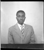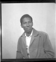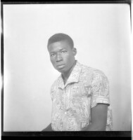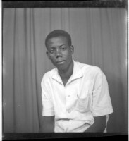 A man sitting in profile in the studio wearing a short sleeved dress shirt.