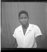 A man sitting facing forward in the studio wearing a white short sleeved dress shirt.