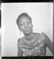 A woman sitting facing forward in the studio wearing a black une camisole, a headscarf, and earrings.