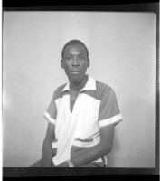 - A man sitting wearing a white and black short sleeved dress shirt and a watch in the studio.