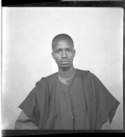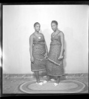 Two women standing on a rug in the studio, both wearing hairstyles, necklaces, une camisoles, and black pagnes.
