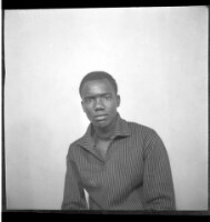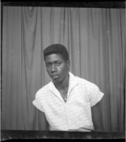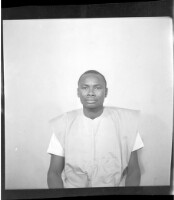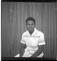 A young man sitting in profile in the studio wearing a white and grey t-shirt and a necklace.