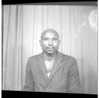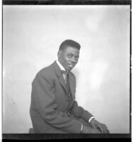 A young man sitting in profile in the studio wearing a white shirt and black suit and tie with a hairstyle.