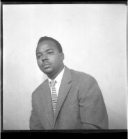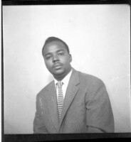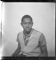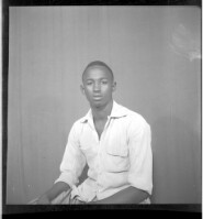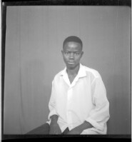 - A young man sitting wearing a white long sleeved shirt in the studio.