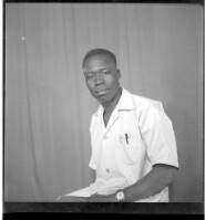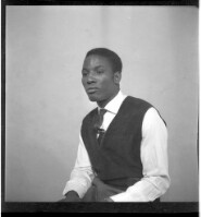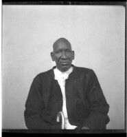 - A man sitting in the studio wearing a large white boubou and black jacket.