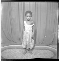 - Full shot of a little girl standing on a rug barefoot, wearing a grey dress, and a hairstyle in the studio.