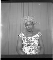 - A woman sitting wearing a une camisole, headscarf, and necklace in the studio.
