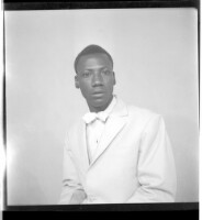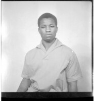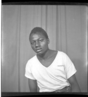 A young man sitting wearing a white short sleeved t shirt in the studio.