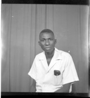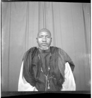 A man sitting wearing a white boubou in the studio.