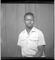 Photo of a family of four people, a woman sitting on a stool wearing a dress, a pagne, and holding a little girl in her arms, and a little boy standing next to her wearing a shirt and trousers, to the left of him a young man wearing a black t-shirt and bl