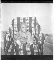 Full shot of a little girl sitting wearing a boubou and smiling in the studio.