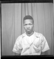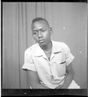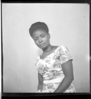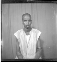 A young, a man sitting wearing a shirt and suit and a woman standing wearing a dress, black headscarf, hairstyle, and earrings with her hands on the man's back in the studio.