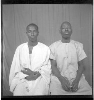 Two men, one standing wearing a white boubou with his arm on the other man sitting on a stool wearing a black embroidered boubou, both on a rug in the studio.