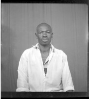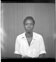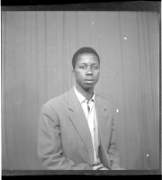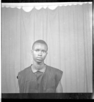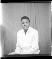 A young man wearing a black short sleeved shirt standing in the studio.