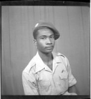 A young man sitting wearing a military uniform in profile in the studio.