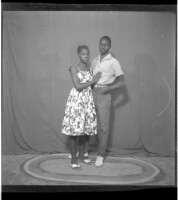 A couple, a woman standing wearing a dress, a hairstyle and white shoes with her arms around a man standing wearing a dress shirt, black pants, and white shoes in the studio.