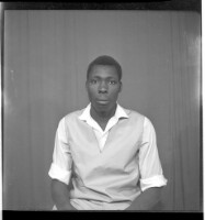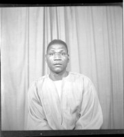 A man sitting wearing a grey boubou facing forward in the studio.