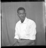 A young man sitting wearing a long sleeved white shirt and vest facing forward in the studio.
