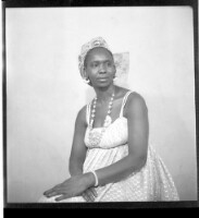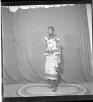 A young girl standing on a rug, her right arm behind her back, wearing a une camisole and pagne, a necklace, and a hairstyle, facing forward in the studio.