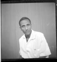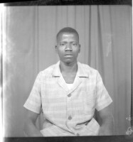 A man sitting wearing a dress shirt with three pockets and short sleeves, facing forward in the studio.