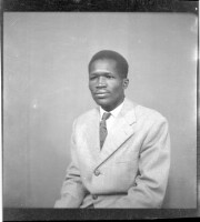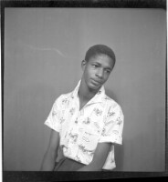 A young man sitting wearing a short sleeved shirt facing forward in the studio.