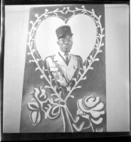 A man standing wearing a police officer uniform behind a portrait with a heart shaped cut out and flower designs, facing forward in the studio.