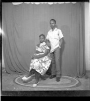 A couple, a woman sitting wearing a white and black dress, a scarf on her chest, a hairstyle, with her arms and legs crossed and white shoes, and a man standing wearing a white short sleeved shirt, a watch, black pants and black shoes, his left arm in his