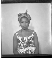 A couple, a woman standing wearing a white dress and white headscarf with her arms on a man wearing a white shirt and black suit and tie and glasses, facing forward in the studio.