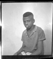 A young boy sitting wearing a black short sleeved t-shirt facing forward in the studio.