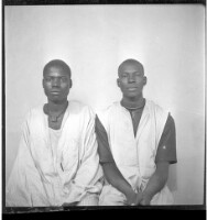 Two men sitting facing forward in the studio, one wearing a white t-shirt and white boubou and the other wearing a black t-shirt and white boubou, both with amulets around their neck.