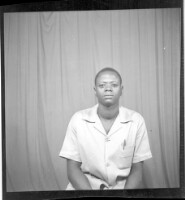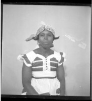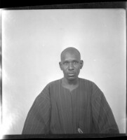 An old woman sitting wearing a black and white une camisole, headscarf, earrings, and a Fulani hairstyle facing forward in the studio.
