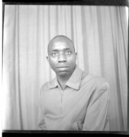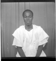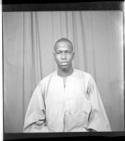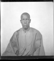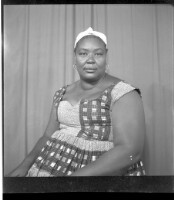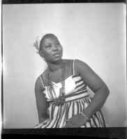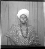 A woman sitting in the studio wearing a pagne, a necklace, and a headscarf in the studio.