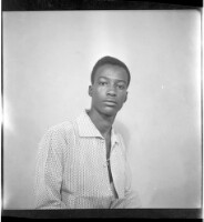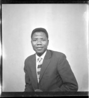 A couple, a man wearing a shirt, suit and tie sitting in profile next to a woman with a light complexion wearing a pagne sitting in profile in the studio.