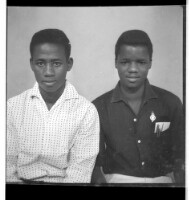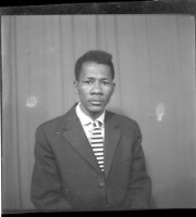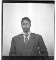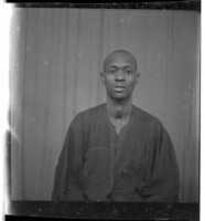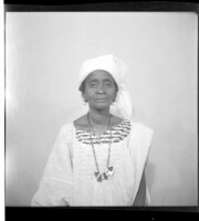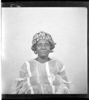 - An old woman wearing a pagne, a necklace, and a headscarf sitting facing forward in the studio.