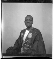 - An old woman wearing a pagne and a headscarf sitting facing forward in the studio.