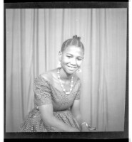 A woman wearing a dress and necklace sitting facing forward in the studio.