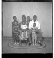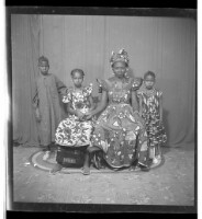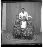 A little girl holding the hand of a woman, both wearing dresses, pagnes, and necklaces, the woman sitting, on her left a little girl wearing a dress and necklace, and on the far right a little boy wearing a boubou. All standing on a rug in the studio.